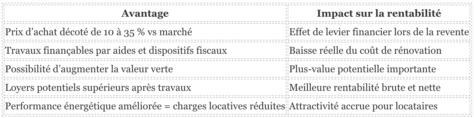 👍 Acheter une passoire thermique, c’est acheter du potentiel. Là où d’autres voient des défauts, un investisseur voit un rendement futur.