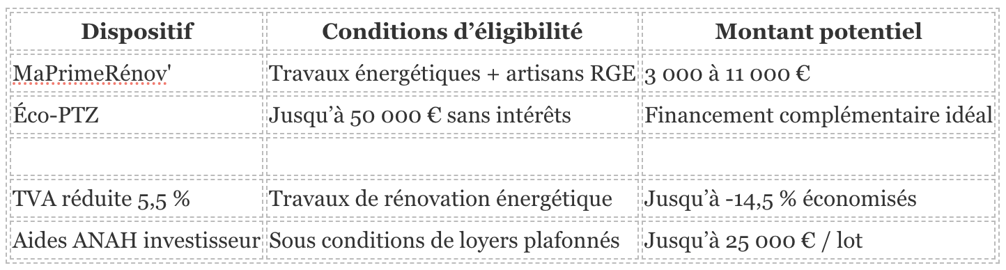 Un point crucial pour réussir un investissement dans une passoire thermique : savoir mobiliser les aides disponibles. Beaucoup d’investisseurs réduisent leur budget de 20 à 60 % grâce à des subventions ciblées.