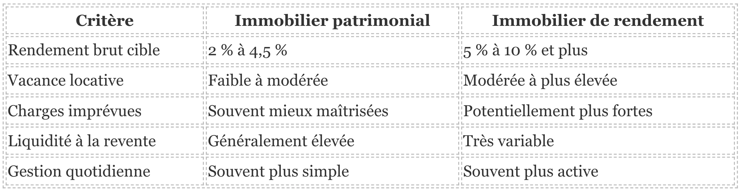 L’immobilier patrimonial vise d’abord la qualité de l’actif, la stabilité de la demande locative, la préservation de la valeur et la revente dans de bonnes conditions. L’immobilier de rendement, lui, cherche à maximiser le revenu locatif rapporté au prix d’achat, quitte à accepter davantage de gestion, plus de vacance potentielle ou un emplacement moins prisé.