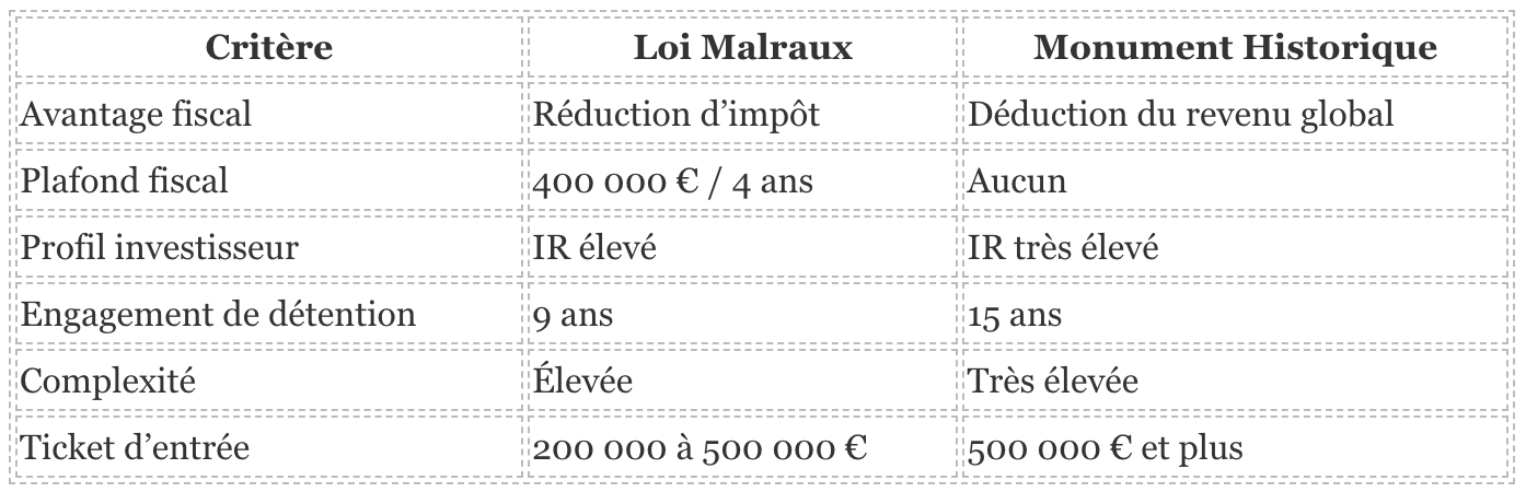 Investir en loi Malraux ou en Monument Historique relève d’une stratégie patrimoniale complète. La loi Malraux offre une réduction d’impôt immédiate, lisible et maîtrisée, adaptée aux investisseurs recherchant un cadre sécurisé avec une durée d’engagement plus courte. Le régime des Monuments Historiques, quant à lui, s’adresse à une élite patrimoniale, capable d’absorber une complexité juridique élevée en contrepartie d’une déduction fiscale exceptionnelle et sans plafond.